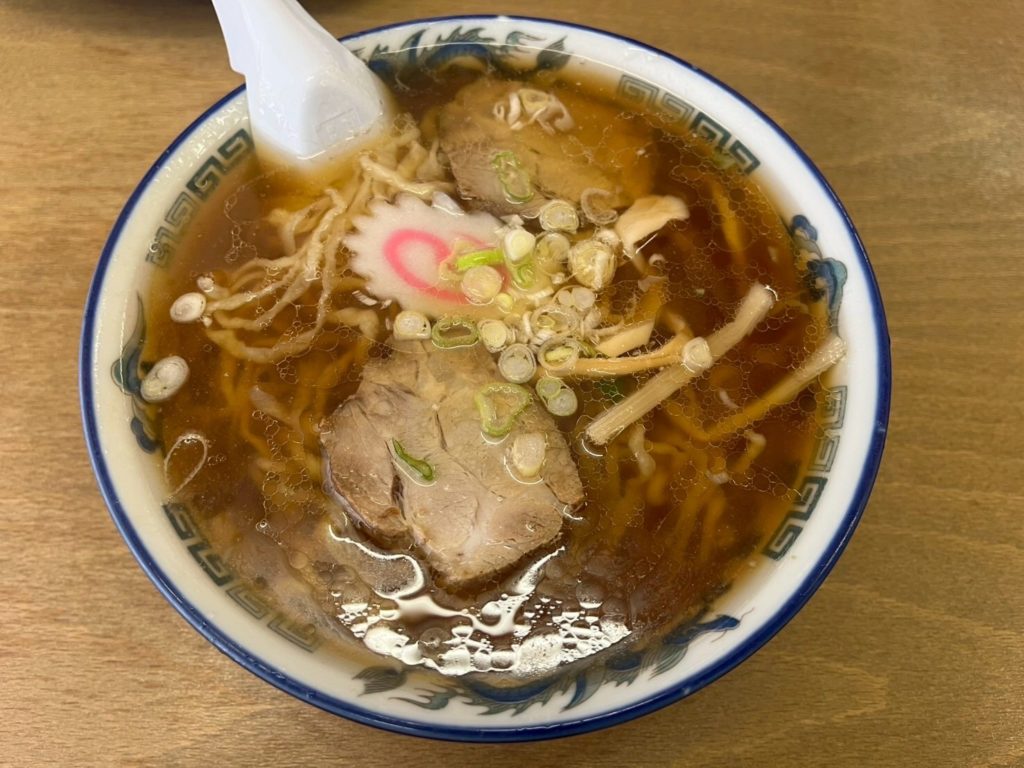鶏ガラの澄んだスープに生姜が効いてさっぱり手打ち縮れ麺に絡んで美味しいです😋